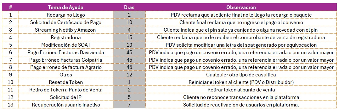 29.Solicitud Cambio a Rol Distribuidor. En este caso el requerimiento se escala al area de riesgos, una vez habilitado, se le informa al cliente, se le emiten las recomendacxiones basicas de buenas practicas del rol, a su vez el tipo de ticket se le Cambia a 30. Solicitud de capacitacion y Asesoria General.
